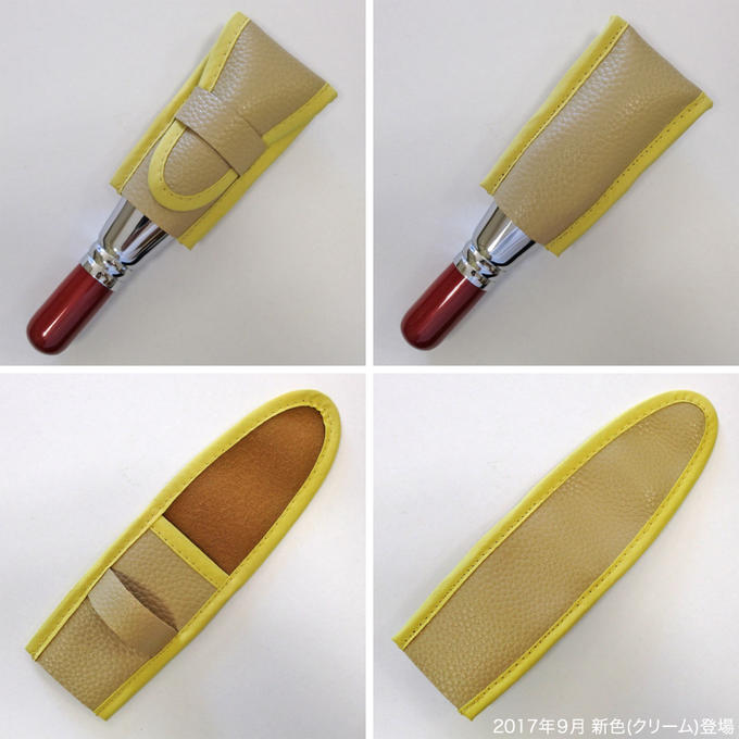 これに比べ、このブラシキャップは、伸縮性のある人工皮革を使用しているため、幅広いパウダーブラシ(フェイスブラシ)を収納する事が可能となっております。