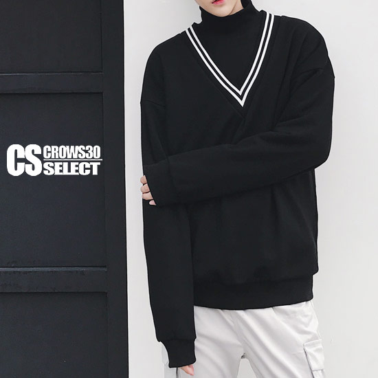 ロングTシャツ メンズ ライン ハイネック 切替 Vネック ロンT インポート トレーナー カットソー 個性的 V系 ビジュアル系 ストリート系 オラオラ系 ビター系 モード系 ファッション 韓国 30代 40代 大人 衣装 送料無料 春 秋 冬 新作 ブラック 黒